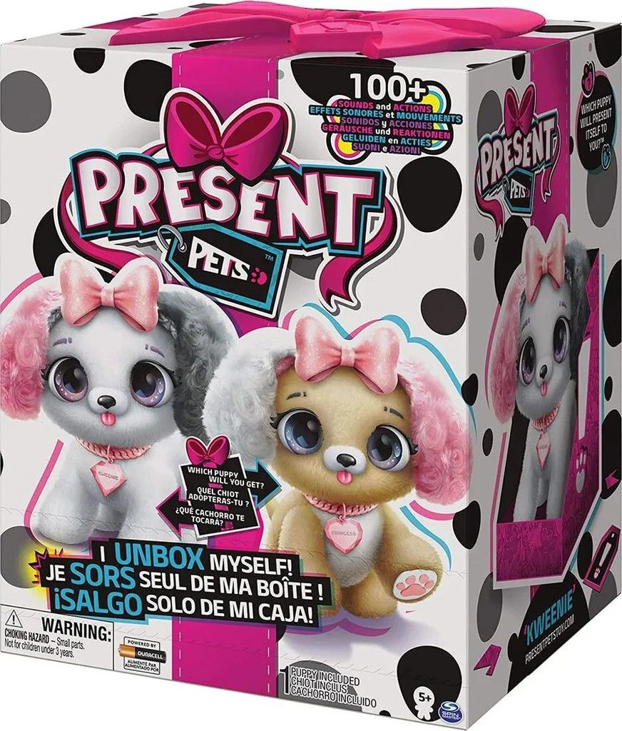 Die Present Pets sind bezaubernde, interaktive Plüschwelpen, die sich von selbst aus ihrer Geschenk-Verpackung befreien. Erst rappelt es im Karton und dann kommen die niedlichen Hunde-Babies nach und nach heraus. Erst dann ist zu sehen, welche Fell-Farbe sie haben.