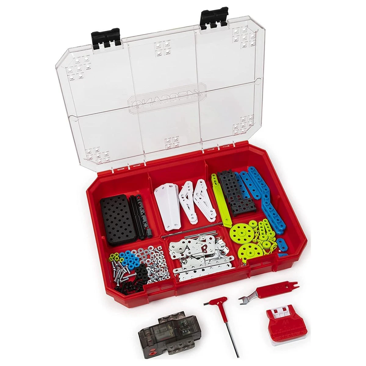 Jedes Set enthält das Wesentliche für einfache Erfindungen in Meccano. Jeder bietet ein anderes Thema für Ihre Bedürfnisse und Bedürfnisse: Zahnräder, Schnellmontagen, Federn, Motor, Getriebe.