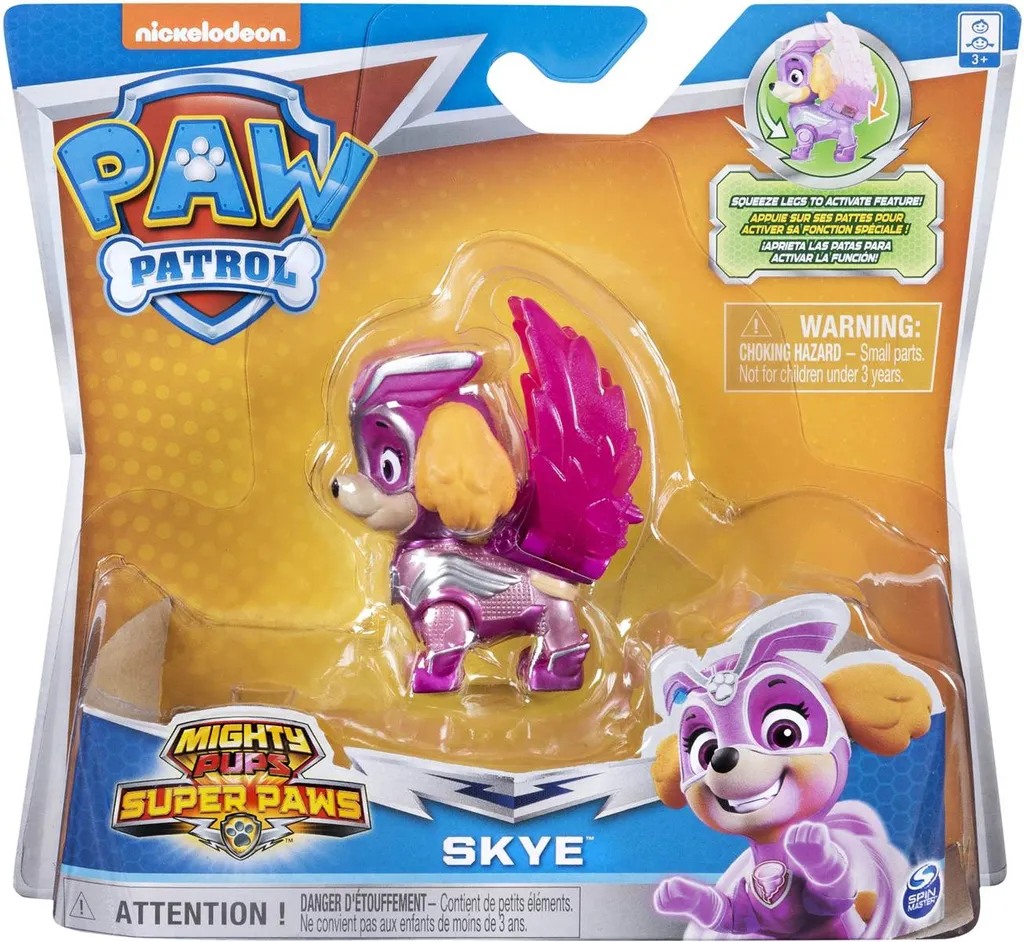 Die beliebte Flugexpertin von PAW Patrol hat ihre Fluguniform gegen eine coole Super PAWs Uniform getauscht und trägt eine rosafarbene, glänzende Metalluniform mit silberfarbenen Akzenten, eine Maske und ein durchscheinendes funktionierendes Action-Pack mit beweglichen Flügeln. Um Skyes Wirbelwindkraft zu aktivieren, drückt man einfach auf ihre Beine, um ihre Flügel auf- und abzubewegen! Mighty Pups Super PAWs Skye bringt die ganze Spannung der erfolgreichen Fernsehsendung nach Hause. Für noch mehr spannende Abenteuer gibt es auch die anderen Super PAWs Welpen zum Sammeln und das Mighty Jet Hauptquartier-Teamfahrzeug (jeweils separat erhältlich).