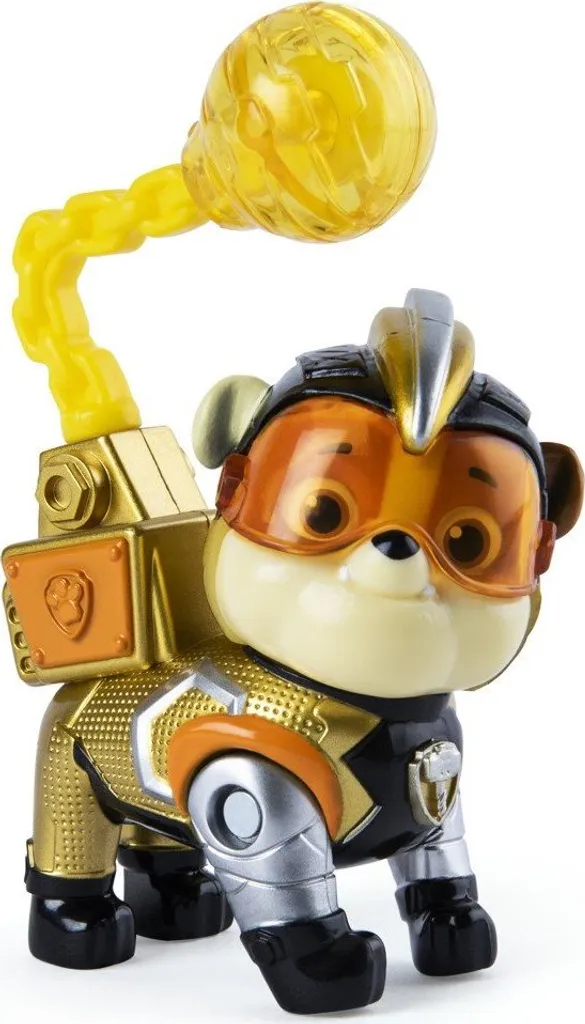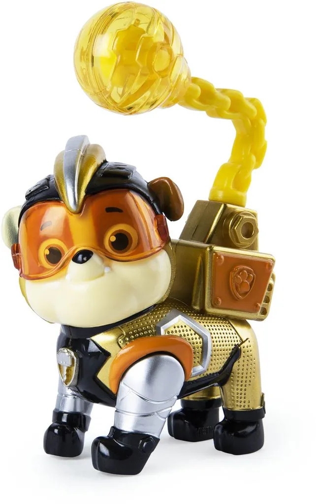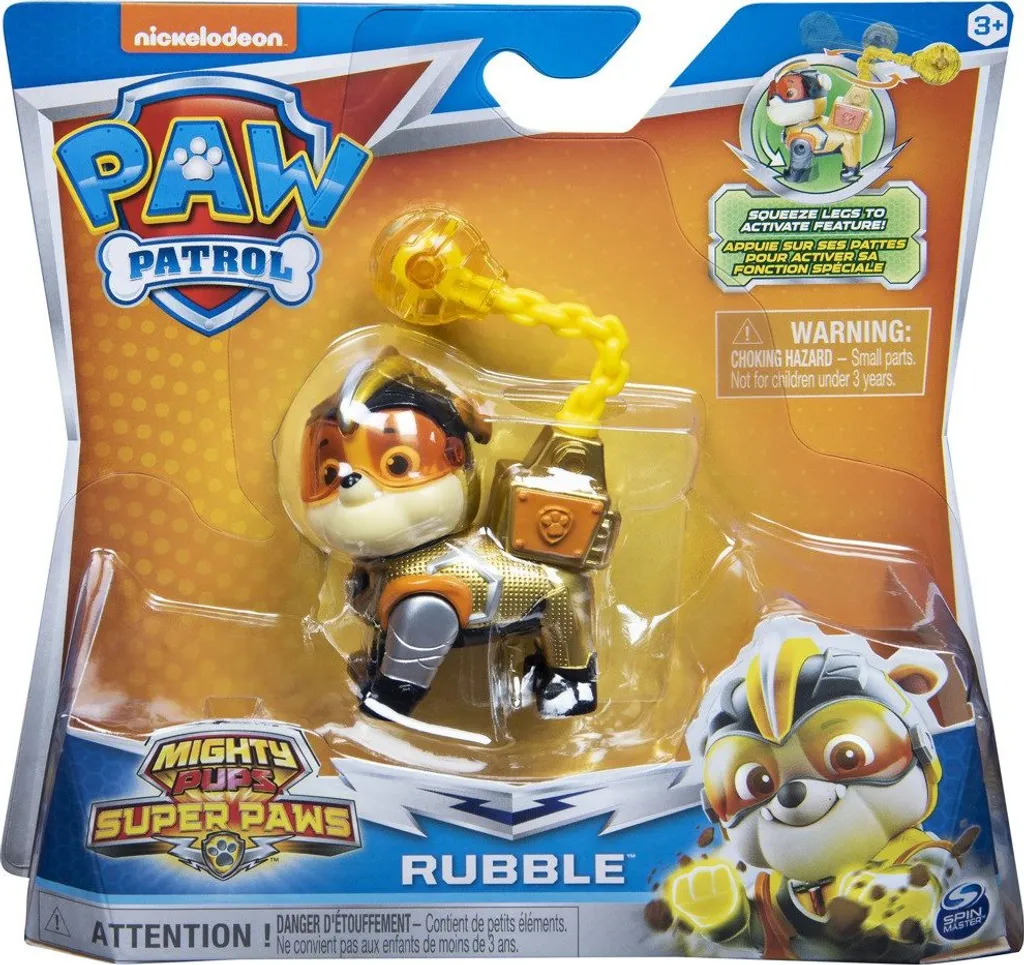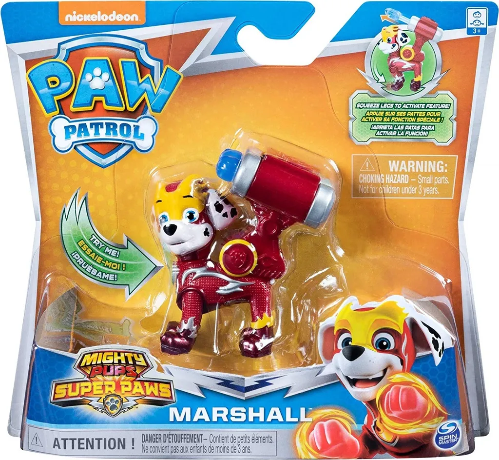 Paw Patrol – Mighty Pups Super Paws Hero Pup FigurenDie Helden der Paw Patrol sind nun auch in ihren Superhelden-Uniformen als Spielfiguren erhältlich, passend zu den Mighty Pups Super Paws Episoden der TV-Serie. Alle sechs Hauptcharaktere sind einzeln erhältlich. Die Hunde verfügen über bewegliche Actionfunktionen, die sich über ein Drücken der Vorderbeine aktivieren lassen. Skye wedelt mit ihren Flügeln, Marshall schießt Wasserkanonen aus seinem Rucksack, Rubble schleudert seine Abrissbirne durch die Luft, Chase feuert seine Lichtgeschwindigkeit ab, Rocky schlägt mit seinem Hammer und Zuma lässt seinen Wasserstrahl los. So können Kinder die Superhelden-Abenteuer ihrer Lieblingswelpen Zuhause nachspielen. Die Figuren sind kompatibel mit den Fahrzeugen und Spielsets von Spin Master und geeignet für Kinder ab 3 Jahren.
