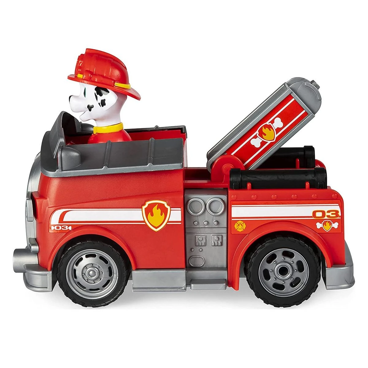 Retten Sie den Tag mit Paw Patrol Marshall und seinem ferngesteuerten Feuerwehrauto. Ihr Kind kann seinen Lieblingsmomente aus der beliebten TV-Serie nachspielen. Mit realistischen Details, einer Leiter, die sich nach oben und unten bewegt, und Marshall im Fahrersitz geformt, ist dieses ferngesteuerte Fahrzeug bereit für Rettungsmissionen. Marshall’s RC Feuerwehrauto enthält eine einfach zu bedienende Fernbedienung mit Zwei-Wege-Lenkung, die genauso aussieht wie das Pup Pad! Mit zwei Tasten kann Ihr Kind problemlos Marshall vorwärts fahren oder mit der anderen Taste rückwärts und drehen – das schlichte Design ist perfekt für Anfänger geeignet. Der Pup Pad Controller hat eine Frequenz von 2,4 GHz, so dass Ihr Kind sein ferngesteuertes Fahrzeug aus bis zu 76 m Entfernung steuern kann. Für weitere aufregende Paw Patrol RC Rettungsmissionen suchen Sie nach Chase’s RC Police Cruiser (separat erhältlich)!
