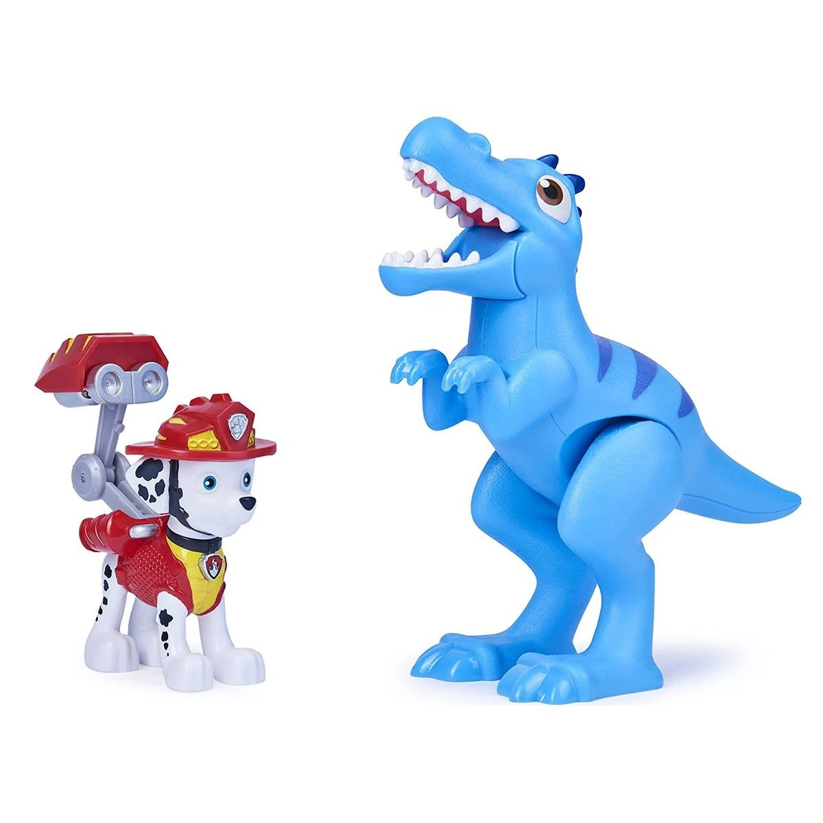 Mit seiner Dino Rescue Uniform ist der beliebte Hund der PAW Patrol sofort einsatzbereit. Mit einem Druck auf Marshalls Abzeichen-Knopf klappt das Werkzeug in seinem Rucksack auf. Der Schwanz der großen Raptor-Dinosaurier-Figur lässt sich nach oben und unten bewegen, damit sich sein Maul öffnet und schließt.
