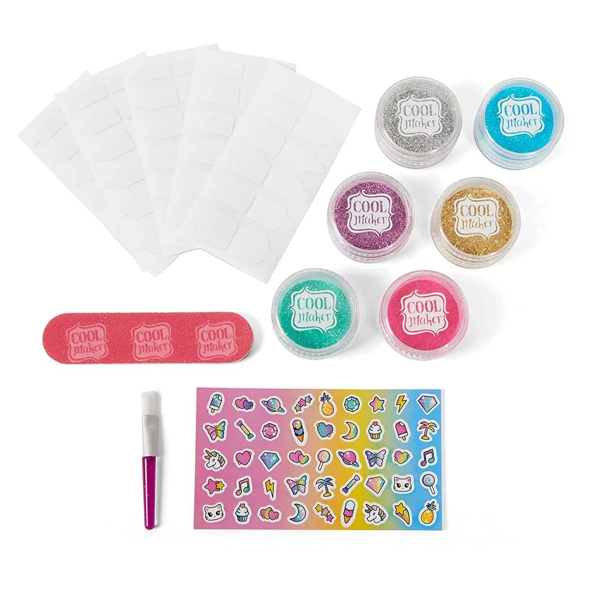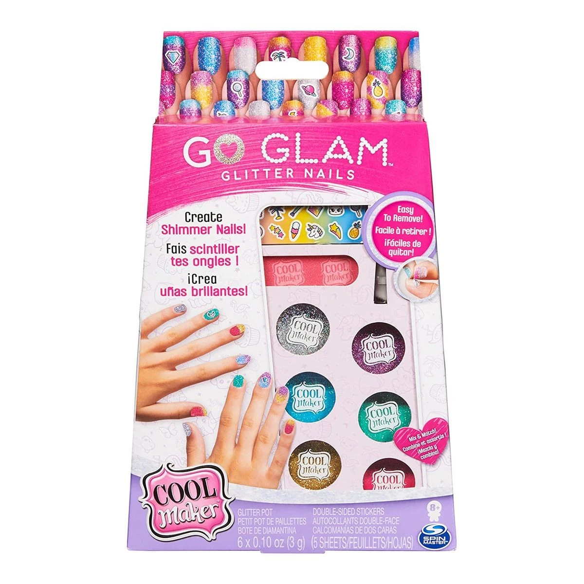 Gestalten Sie funkelnde Maniküre mit dem Cool Maker Go Glam Glitzer-Nagelset. Dieses lustige Aktivitätsset kommt mit allem, was Sie brauchen, um fünf schimmernde Maniküre zu kreieren und anzupassen. Es ist einfach, Ihre Maniküre ohne Nagellack aufzutragen. Legen Sie die doppelseitigen Aufkleber auf Ihre Nägel, ziehen Sie die Rückseite ab und glätten Sie die Kanten Ihrer Nägel mit der Nagelfeile. Als nächstes wählen Sie Ihren Glitzer – mit sechs verschiedenen Farben gibt es so viele Möglichkeiten zu funkeln. Tauchen Sie den Mini-Pinsel in den Glitzer-Topf und gestalten Sie Ihre Nägel wie Sie möchten. Mischen und kombinieren Sie Glitzerfarben oder fügen Sie einige trendige Nagelaufkleber hinzu, um Ihren eigenen einzigartigen Stil auszudrücken. Folgen Sie den einfachen Anweisungen, um verschiedene Nageltrends wie Ombré, Multicolor oder Dipped Nails auszuprobieren. Wenn Sie bereit sind, Ihre Glitzernägel zu entfernen, drücken Sie einfach und schälen Sie, um die doppelseitigen Nagelaufkleber zu entfernen und wieder zu entwerfen. Für weitere Möglichkeiten, um Ihren Look zu personalisieren, suchen Sie nach dem Cool Maker Hollywood Haarverlängerungs-Maker, 2-in-1 KumiKreator und Go Glam Nagelstudio.