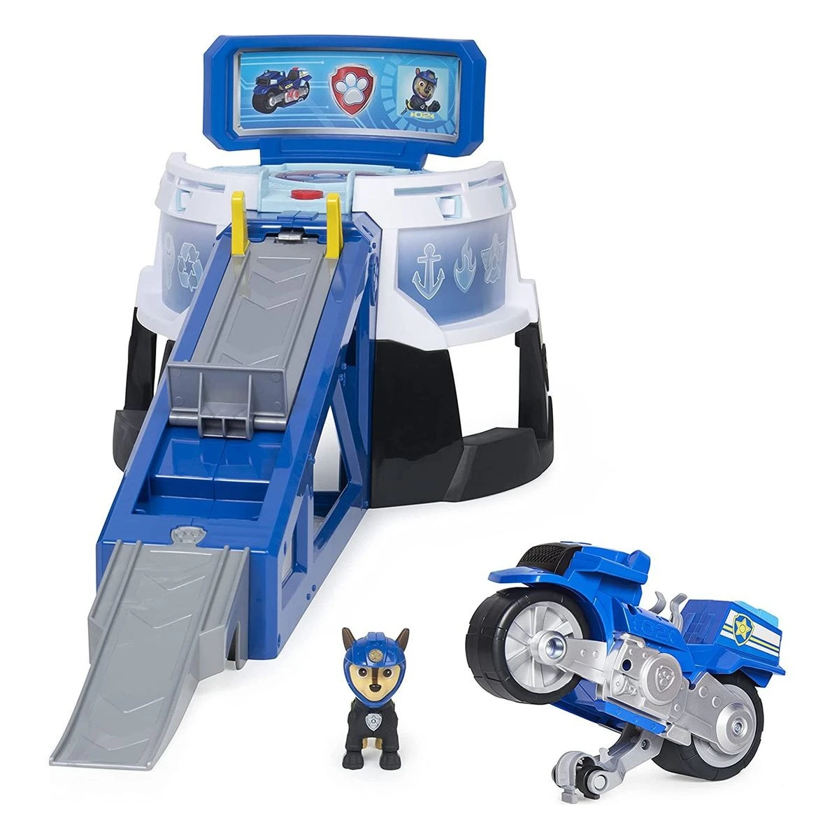 Mit dem Paw Patrol Moto HQ Hauptquartier-Spielset kann Chase mit dem Motorrad zur Rettung rasen. Mit Sounds und einer Motorrad-Startrampe sieht dieses tolle Spielset genauso aus wie das actiongeladene Paw Patrol-Hauptquartier aus der TV-Sendung. Einfach Chase (Figur enthalten) in die Kommandozentrale setzen und auf die Abzeichentaste drücken, um eine neue Mission zu erhalten und die Sound-Effekte des Moto Hauptquartiers zu aktivieren.