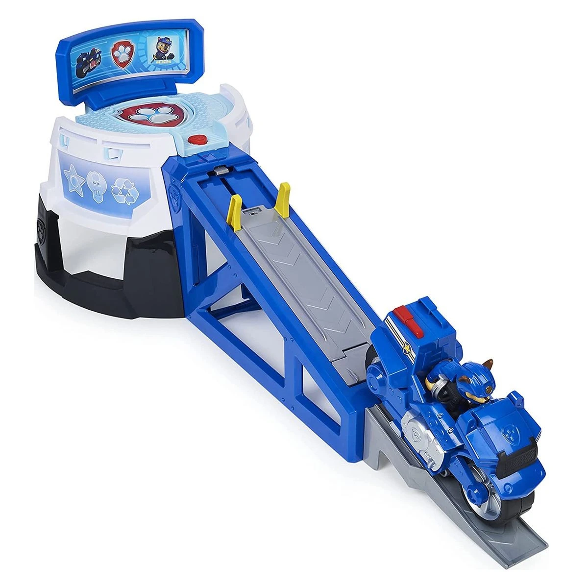 Um zur Mission aufzubrechen, setzt man Chase auf sein exklusives Motorrad (im Lieferumfang enthalten). Dann das Fahrzeug nach unten drücken und gleichzeitig die Rampe hochschieben, bis es einrastet. Durch Drücken der kleinen Abzeichentaste des Spielsets wird das Motorrad gestartet, und Chase rast die Rampe hinunter und saust mit einem Wheelie zur Rettung.