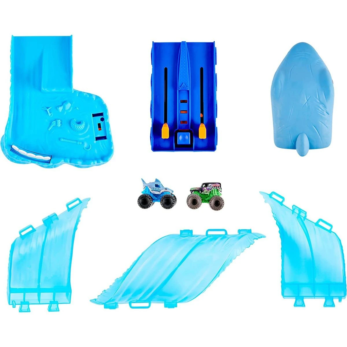 Lasse die Monster Jam Minis durch eine böse Welle und in einen riesigen Haifischkopf rasen. Sind sie schnell genug, um es durch die Welle zu schaffen, ohne sich zu zerkleinern?