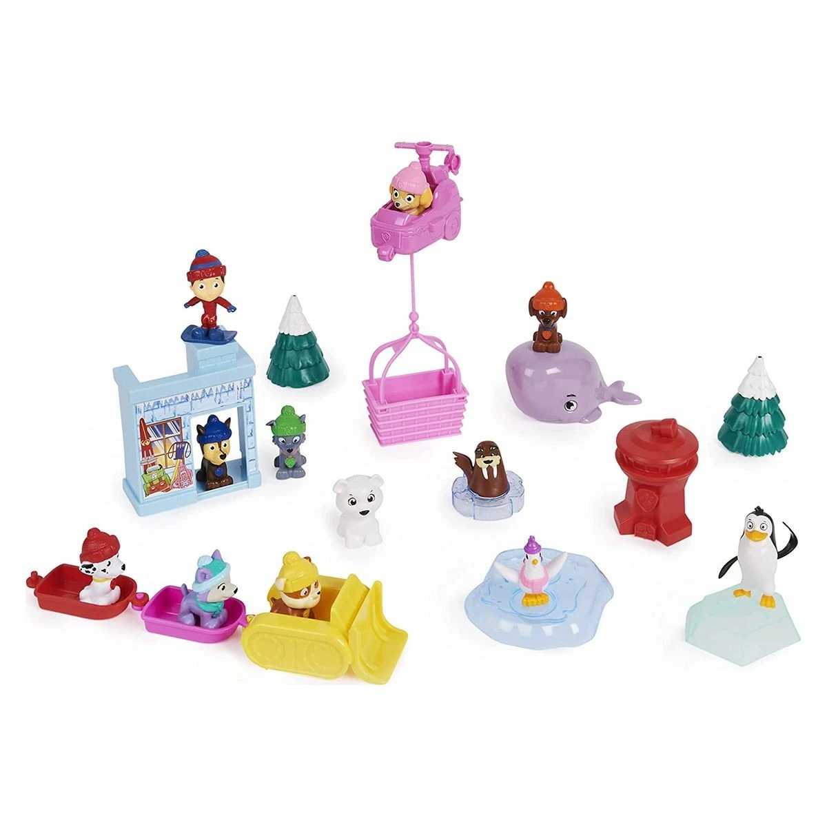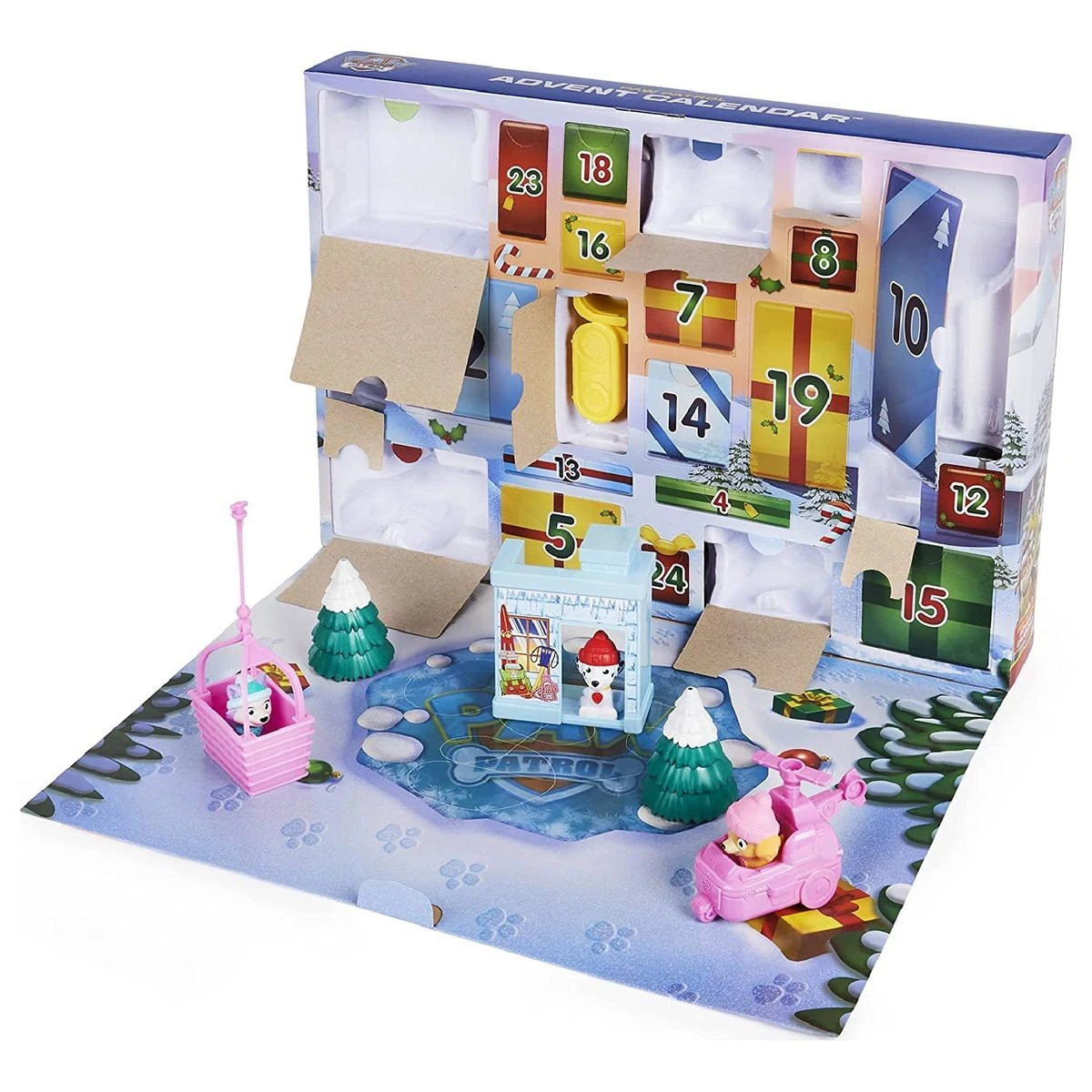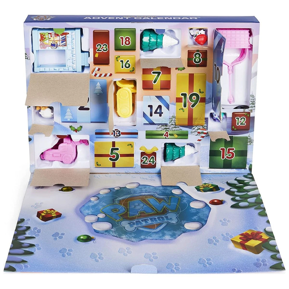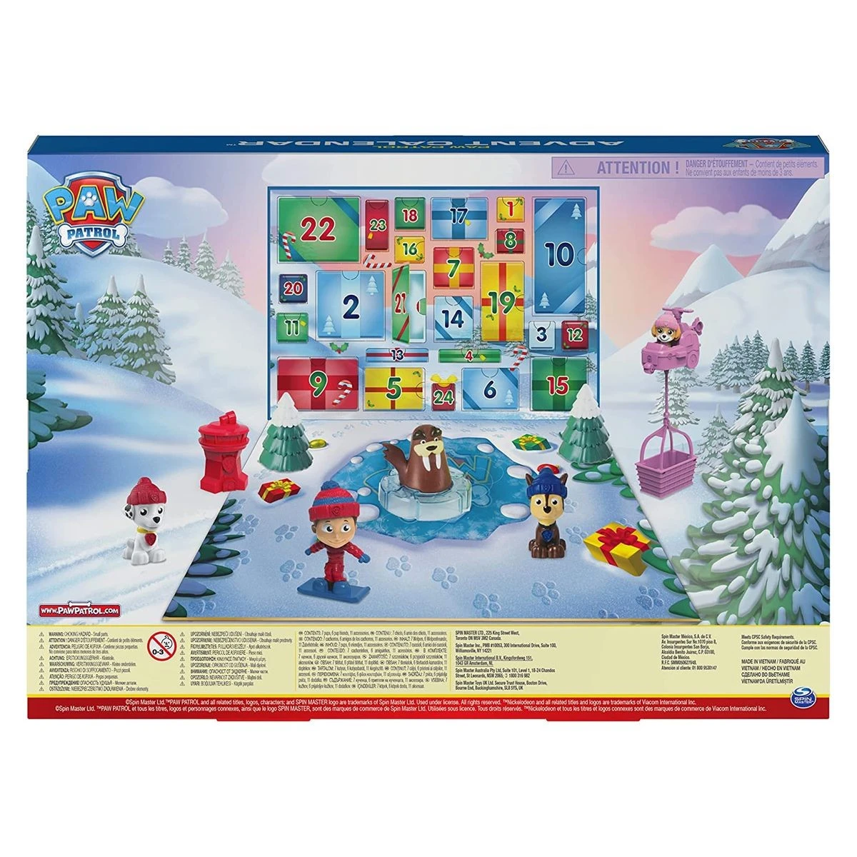 Es gibt 24 exklusive Geschenke und hinter jeder Tür wartet eine neue Überraschung. Die Kinder finden ihre geliebten sieben Welpen (Chase, Marshall, Skye, Rubble, Rocky, Zuma und Everest) im Winter-Outfit, Freunde wie Wally Walross und Henrietta, das Huhn und vieles mehr. Wenn alle 24 Geschenke geöffnet wurden, können die Kinder eine fantasievolle Abenteuerbucht-Winterlandschaft aufbauen und die Welpen auf spannende Missionen schicken. Dieser Adventskalender für Kinder ist der perfekte Start in die Weihnachtszeit.