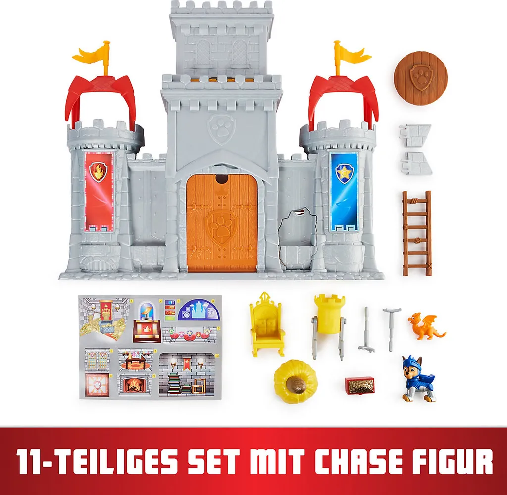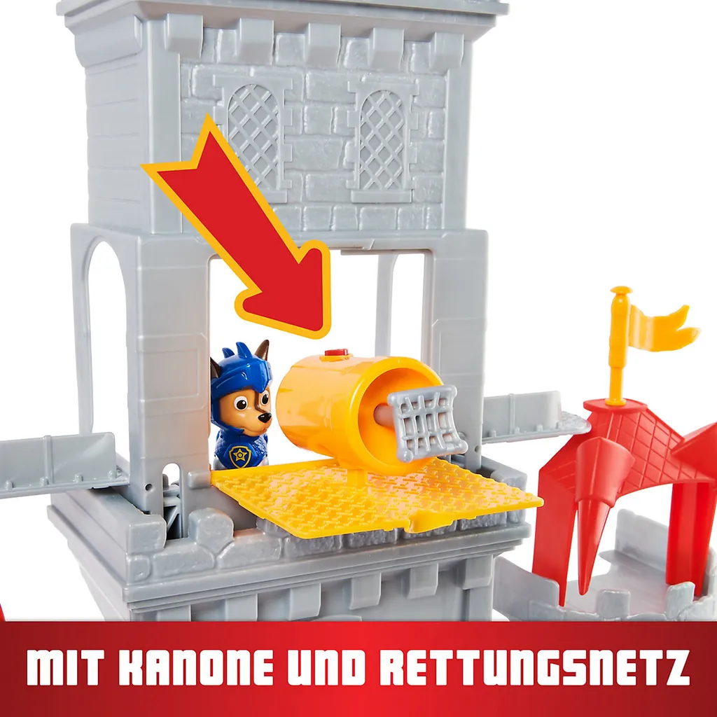 Die Welpen der PAW Patrol begeben sich für ihre neuesten Abenteuer in die Zeit der Burgen und Drachen!it prächtigen Ritterrüstungen ausgestattet, begegnen die tapferen Fellfreunde einem mittelalterlichen Widersacher: Der Welpen Bösewicht Claw reitet auf seinem Drachen Sparks durch die Lüfte und führt dabei nichts Gutes im Schilde! Auf den wertvollen Schatz der Rescue Knights haben es die beiden Schurken abgesehen. Doch mit vereinten Kräften verteidigen Chase, Marshall und Co. ihr brandneues Hauptquartier, eine transformierbare Ritterburg. Diese ist mit allerlei Finessen ausgestattet, inklusive verborgenen Bodenklappen und heimlichen Fluchttüren.Achtung – Claw greift die Burg aus der Luft an! Kein Problem für die PAW Patrol mit ihrem neuen Ritter-Equipment! Gemeinsam verteidigen die heldenhaften Welpen-Freunde in authentischen Ritterrüstungen ihr brandneues Hauptquartier. Mit der 50 Zentimeter großen, 360 Grad bespielbaren Ritterburg erleben die Kinder die epischen Abenteuer ihrer kleinen großen Helden hautnah. Besonderes Highlight: Die Burg lässt sich im Handumdrehen in ein wehrhaftes Fort transformieren. Im Set sind zudem elf verschiedene Zubehörteile vom Thron bis zum Mini-Drachen enthalten. So viele Zimmer mit spannenden Zusatzfunktionen für die Rescue-Knights-Welpen! Hier lässt sich der Schatz mit einem Handgriff hinter einer geheimen Drehtür verbergen, dort können die Fellfreunde vom Turm aus Rettungsnetze abschießen oder Bösewicht Claw per Falltür ins Verlies befördern. Die Lage ist unübersichtlich? Ganz oben am Beobachtungsturm haben die Rettungsritter den perfekten Ausblick auf die Umgebung rund um die Burg. In mehr als sieben fantasieanregenden Spielbereichen finden Mittelaltermissionen und echte PAW-Momente voller Teamwork und Action im Kinderzimmer kein Ende.