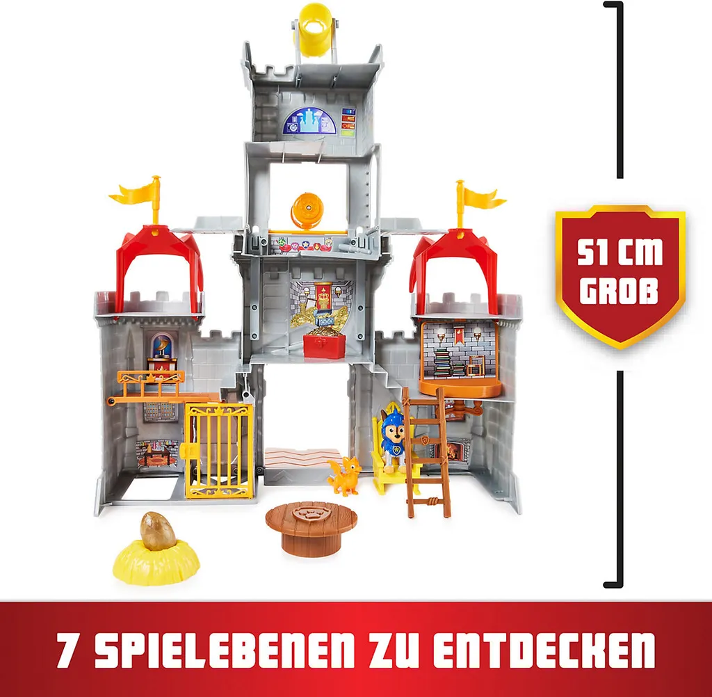 Das ca. 51cm hohe Ritterburg Spielset stellt eine authentische Nachbildung des Hauptquartiers der Ritter-Abenteuer dar. Es ist von allen Seiten (360°) bespielbar und bietet auf der Rückseite 7 verschiedene Areale zum Spielen und Entdecken. Unten befinden sich das Verlies mit Gitter und Geheimtür sowie das Kaminzimmer. Über die große Zugbrücke können Basis Fahrzeuge auf das Burg-Gelände fahren. Eine Ebene darüber liegen die Bibliothek mit verstecktem Zugang zur Schatzkammer und eine Falltür. Im Mittelturm befinden sich die Schatzkammer, die Kanone (Geschosse enthalten) und das Fernrohr. Weitere Ebenen dienen als Aussichtsplattformen. Der Hauptturm der Burg lässt sich nach oben aufklappen, so haben die Welpen den optimalen Überblick.