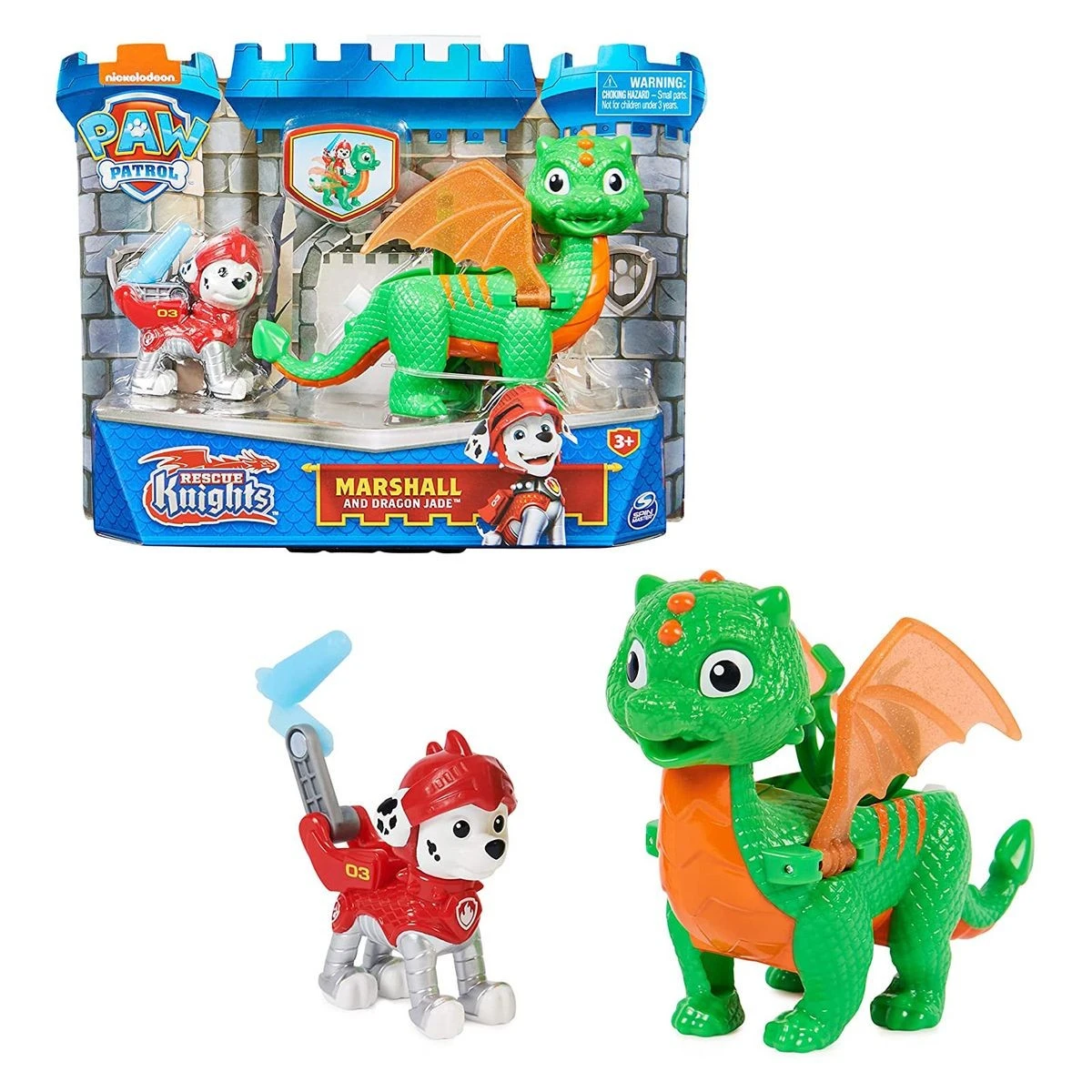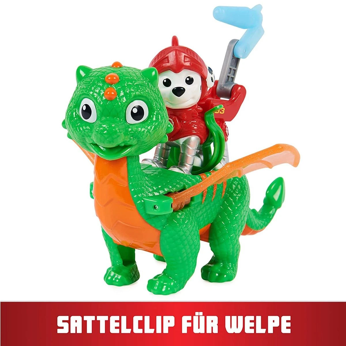 Mit den Spielfiguren-Sets mit je 1 Welpenfigur in Ritterrüstung und 1 Drachenfigur können kleine PAW Patrol Fans ab 3 Jahren die neuen Rescue Knights Abenteuer aus der Animationsserie authentisch nachspielen. Die Geschichten lassen jedes Ritter-Herz höher schlagen: Schauplatz der mittelalterlichen Missionen ist eine Burg, die Fellnasen schlüpfen in authentische Ritter-Rüstungen und ein Drache treibt sein Unwesen. Die Welpenfiguren im Maßstab der Hero Pups sind ca. 6 cm groß und verfügen über bewegliche Werkzeuge am Rucksack. Sie können den Kopf bewegen, sind ansonsten aber steif. Die ebenfalls in jedem Set enthaltenen Drachenfiguren sind ca. 15 cm lang und verfügen über einen Knopf am Schwanz, mit dem sie die glitzernden Flügel schlagen können. Auf dem Rücken tragen sie eine Klammer, in der Hero Pups Spielfiguren befestigt werden können. Auch die Drachen können, neben ihren Flügeln, den Kopf bewegen und sind ansonsten aber ebenfalls steif.
