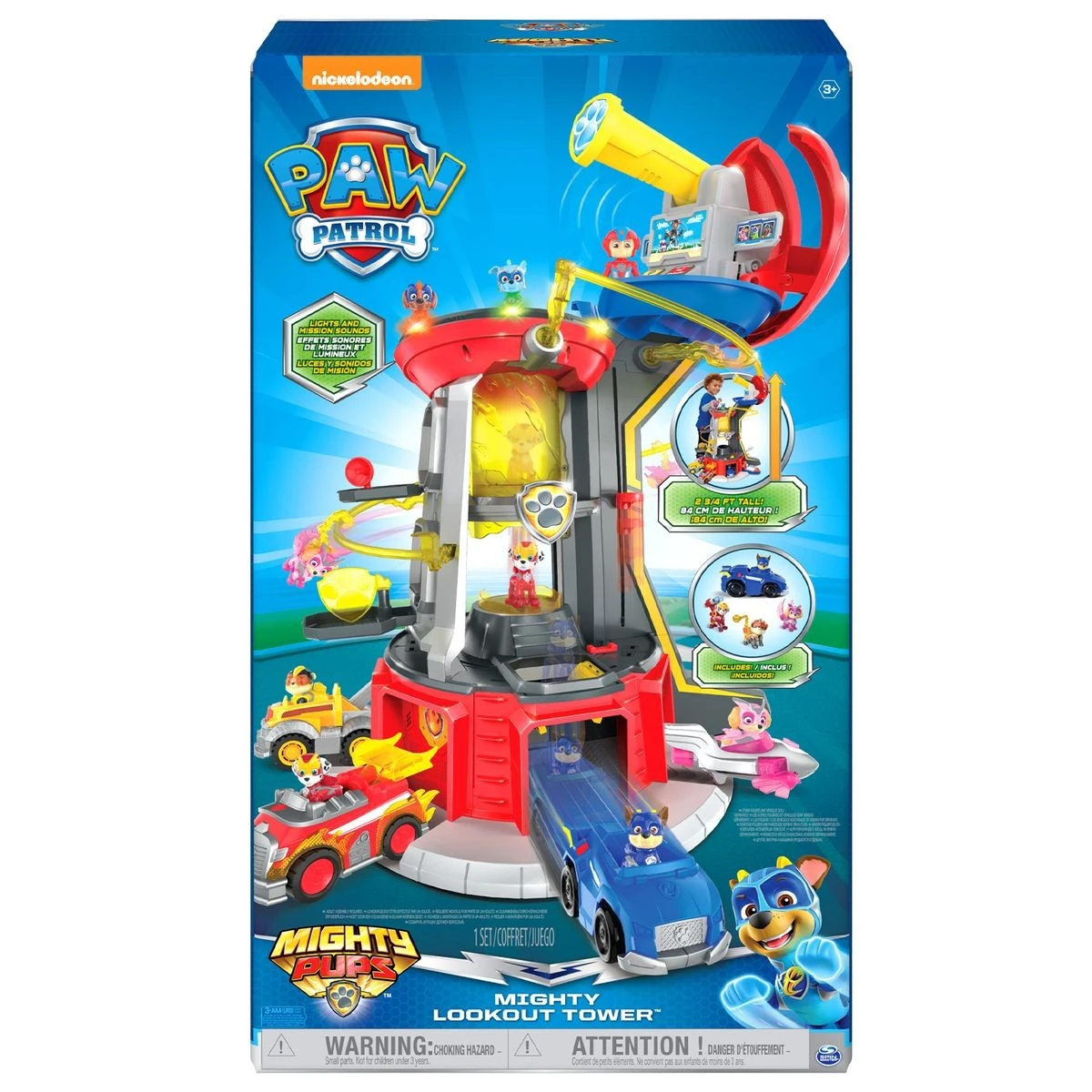 In ihren neuen Mighty Pups Abenteuern retten Chase, Marshall, Skye, Everest, Zuma, Rubble und Rocky mit ihren Superkräften jede Situation. In der Hauptzentrale, dem Mighty Tower, treffen sie sich (im Set enthalten: Chase, Marshall, Rubble, Skye) zur Einsatzbesprechung und springen von dort in ihre Fahrzeuge (1 Chase Fahrzeug enthalten). Der 84cm große Nachbau des Hauptquartiers verfügt über jede Menge Actionfunktionen zum Nachspielen der Abenteuer.