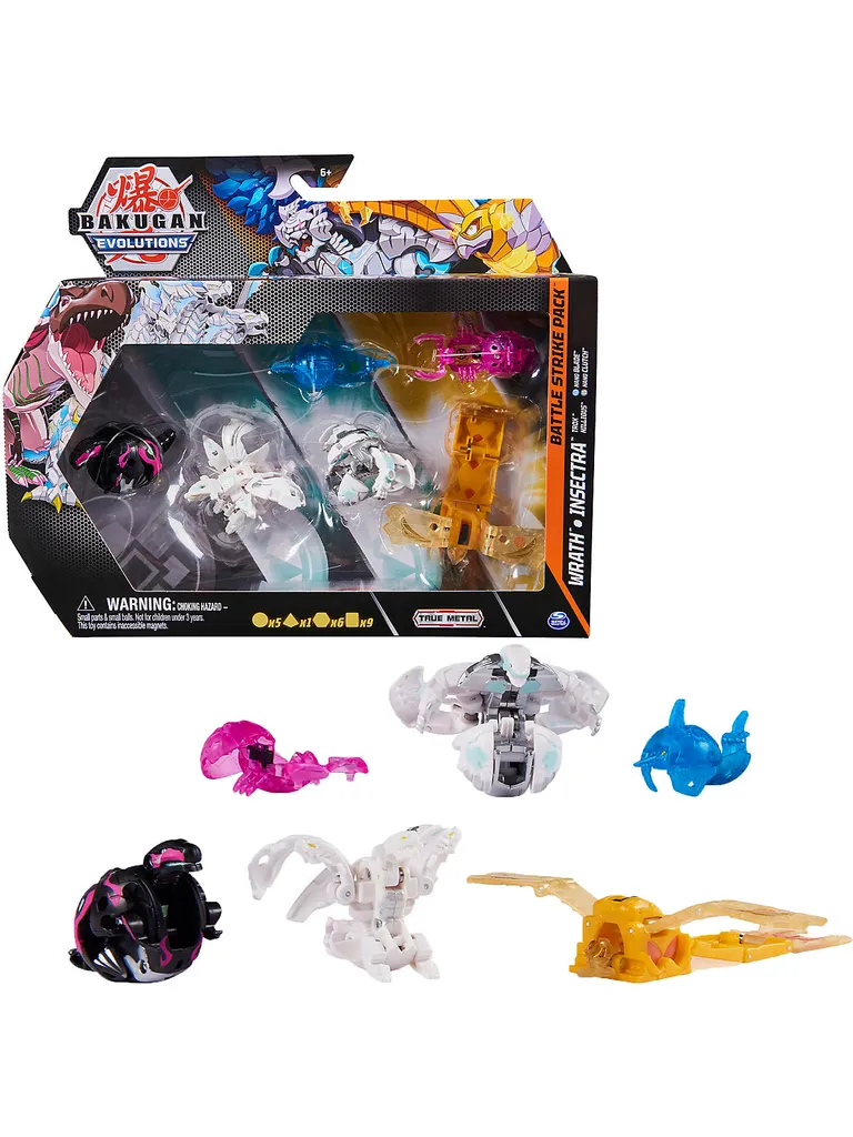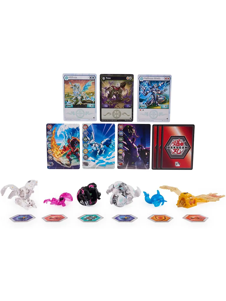 Inhalt: 1 Platinum Series Bakugan (Haos Wrath), 2 Bakugan (Darkus Trox, Haos Nillious), 1 Geogan (Ventus Arcleon), 2 Nanogan (Aquos Blade, Darkus Clutch), 6 BakuCores, 3 Portalkarten, 3 Charakterkarten, 3 Fähigkeitskarten, 1 Spielanleitung, 1 Sammelübersicht