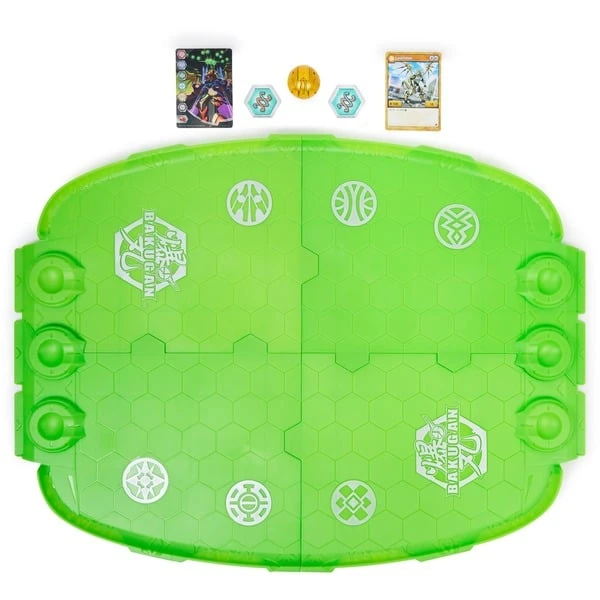 Mit der Bakugan Evolutions Battle Arena in coolem Neongrün lassen sich die Duelle mit Freunden auf ein anderes Level heben. Sie ist mit Haltevorrichtungen für die 3 Bakugan und dazugehörigen Charakterkarten ausgestattet, verfügt über eine Spielfläche im Hexagon-Muster, die das Auslegen der BakuCores erleichtert und hat außerdem gebogene Wände, damit die Bälle nicht aus dem Spiel rollen. Die aus Kunststoff gefertigte Arena kann einfach in 4 Teile zerlegt werden und lässt und so überall mit hin nehmen. Neben den Teilen für das Spielfeld enthält die Packung einen exklusiven (goldenen) Aurelus Leonidas Bakugan Ball der neuen Staffel „Evolutions“. Nach Auswahl der 3 Bakugan für das Duell und Auslegen der BakuCores – oder im vereinfachten Spielprinzip der Portalkarten – kann es auch schon losgehen. Einfach die Bakugan-Bälle die Rampen der Haltevorrichtungen runterrollen und ins Battle schicken. Wer gewinnt am Ende und nimmt den Sieg mit nach Hause?