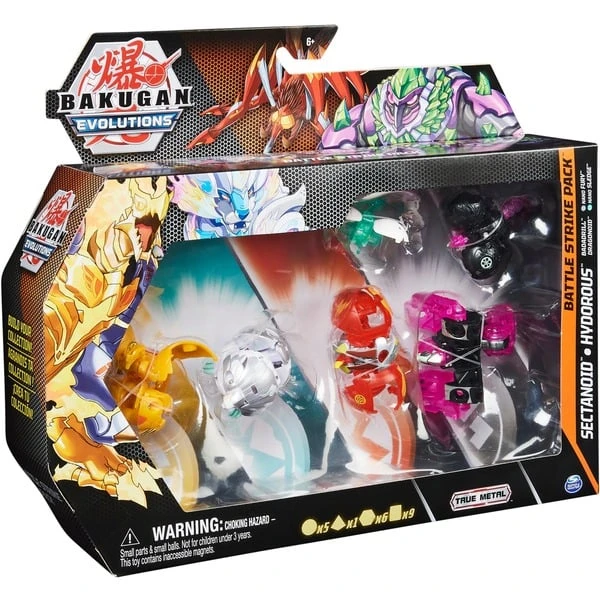| Inhalt/Ausstattung | 1 Platinum Series Bakugan (Pyrus Sectanoid), 2 Bakugan (Aurelus Dragonoid, Haos Hydorous), 1 Geogan (Darkus Badadrill), 2 Nanogan (Darkus Fury, Haos Sledge), 6 BakuCores, 3 Portalkarten, 3 Charakterkarten, 3 Fähigkeitskarten, 1 Spielanleitung, 1 Sammelübersicht | ||