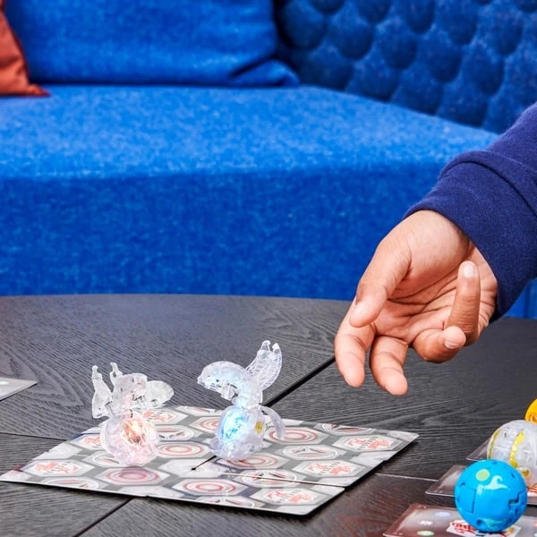 Die Bakugan Genesis Collection 8 bringt Kinderaugen zum Leuchten, genau wie die Bakugan selber! Mit insgesamt 8 exklusiven Bakugan-Bällen ist sie ein extra großes Pack. Und für zwei Spieler kann sie direkt genutzt werden, um in ein Battle zu starten. Dafür können die vier Bakugan Basic Balls im ‘Evolutions‘ genutzt werden – oder gleich das Highlight, die Genesis Bakugan (Dragonoid oder Wrath, je nachdem, ob man sich für das gute oder das böse Team entscheidet) aus dem Finale der 4. Serienstaffel. Sobald sie sich vom Ball in eine detailreiche Actionfigur verwandeln, leuchten sie in allen Fraktionsfarben und die Farbe, bei der der Zufallsmechanismus stoppt, definiert den B-Power-Bonus. Ist ein Spieler im Duell unterlegen, kann er einen der 2 Nanogan (Mini-Bakugan, der sich per Hand entfalten lässt und auf einem Bakugan anbringen lässt) einsetzen, um einen Überraschungsangriff zu starten. Damit lässt sich die B-Power ebenfalls nochmal erhöhen und der Gegner möglicherweise noch besiegen. Sollte mal kein Battle gegen Freunde anstehen: Die Genesis-Bakugan können auf den mitgelieferten Ausstellungsplattformen präsentiert und der Leuchteffekt der LED-Lichter bewundert werden.Art.-Nr.: 1850026