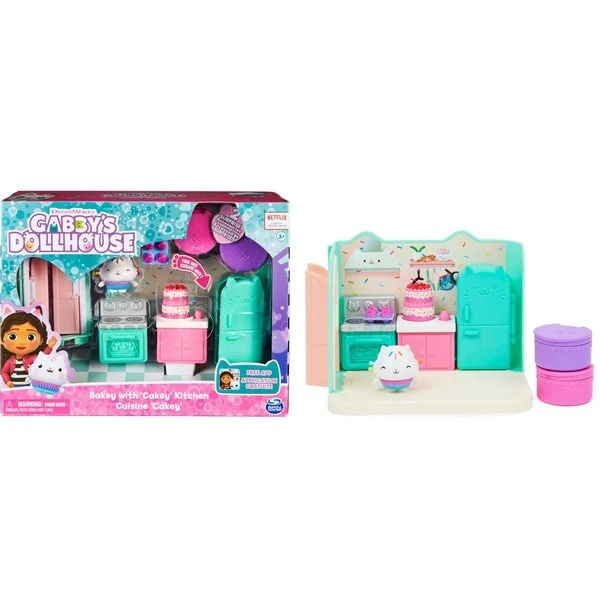 Die DreamWorks Gabby’s Dollhouse Spielzeuge von Spin Master lassen Vorschulkinder in die katz-tastische Welt der beliebten Animationsserie Gabby’s Dollhouse eintauchen. Mit dem detailgetreuen Deluxe-Raum Bakey with Cakey Küche mit der Kuchi Katzenfigur können die magischen Abenteuer der Serie authentisch nachgespielt werden. Dieser Deluxe-Raum steckt voller liebevoller Details und Überraschungen, die es zu entdecken gilt. Neben der Katzenfigur, den Küchenmöbeln und liebevollen Einrichtungs-Accessoires kommt jeder Deluxe-Raum mit zwei Cat Deliveries Überraschungsboxen. Genau wie Gabby zu Beginn jeder Folge können die Lieferpäckchen geöffnet werden, um die geheimnisvollen Zubehörteile des Sets zu entdecken. Katze Kuchi die Kochhaube aufsetzen und einige Leckereien im Ofen zubereiten. Wenn sie fertig gebacken sind, den Kuchen und die Cupcakes im Kätzchen-Kühlschrank verstauen – die Tür lässt sich wirklich öffnen. Kuchi anschließend auf den Kuchen setzen und den Knopf für eine bunte Streusel-Party drücken! In diesem detailreichen Raum mit den vielen Funktionen können Kinder ihrer Fantasie freien Lauf lassen für magische Gabby Momente zuhause.Art.-Nr.: 1903342