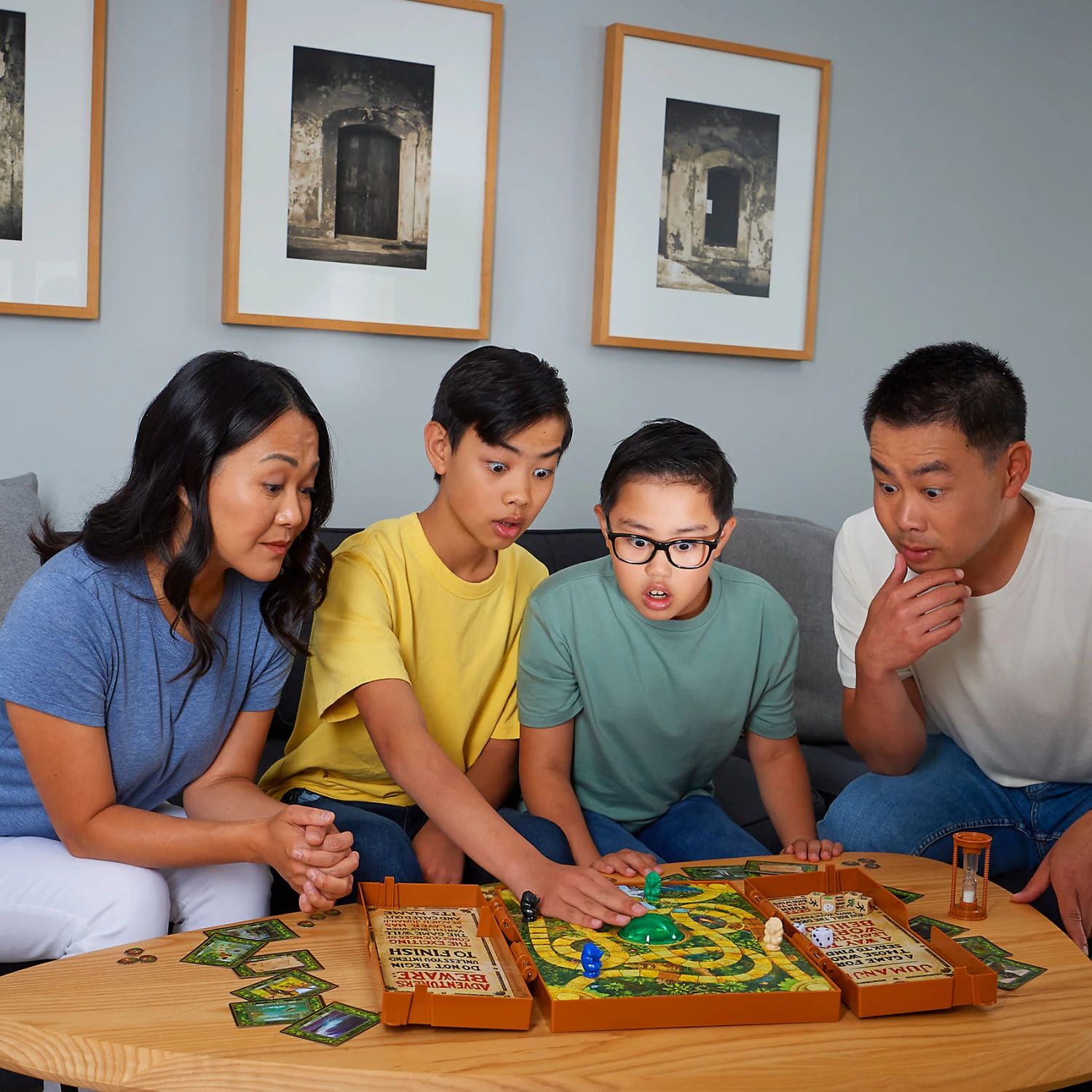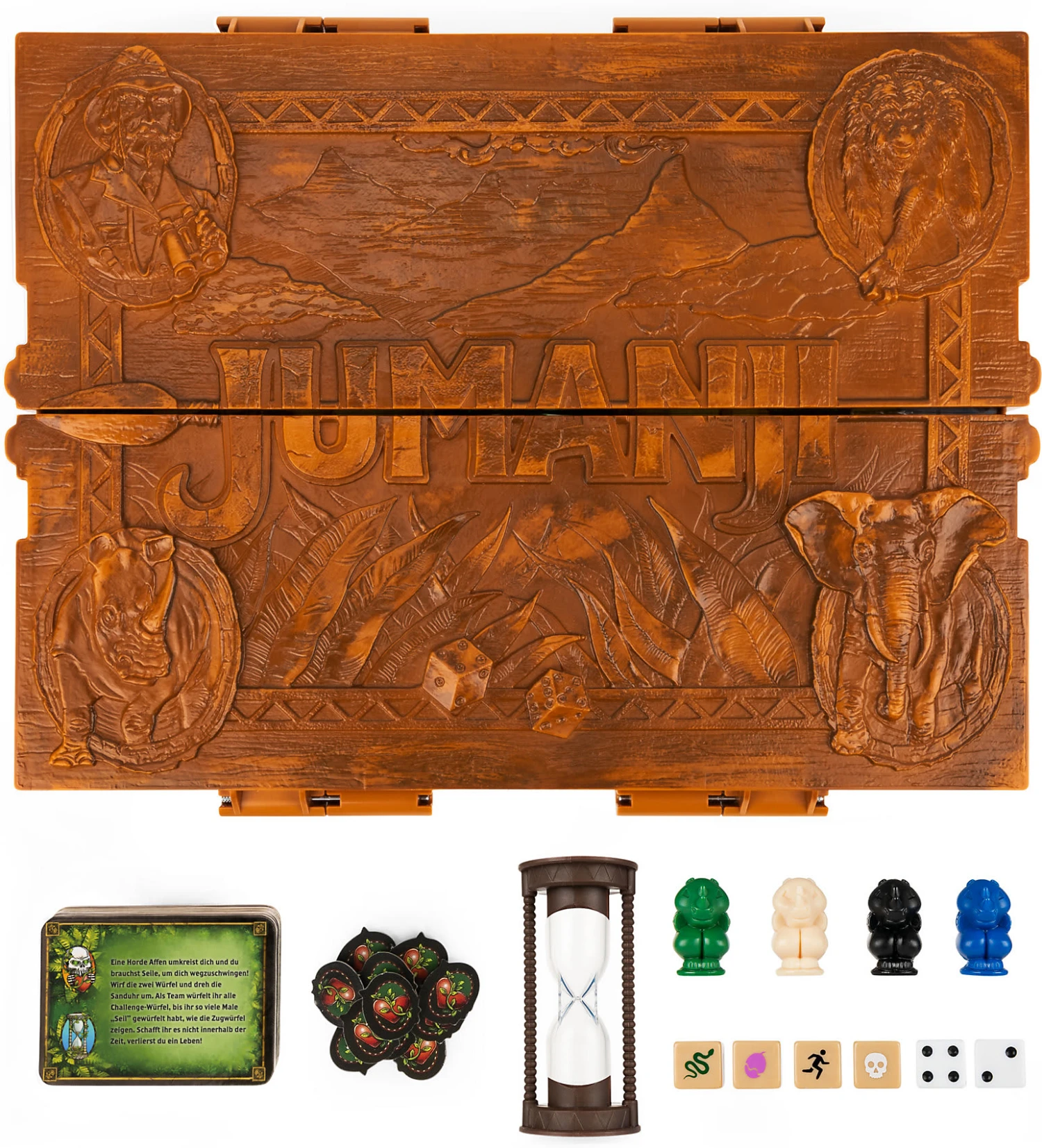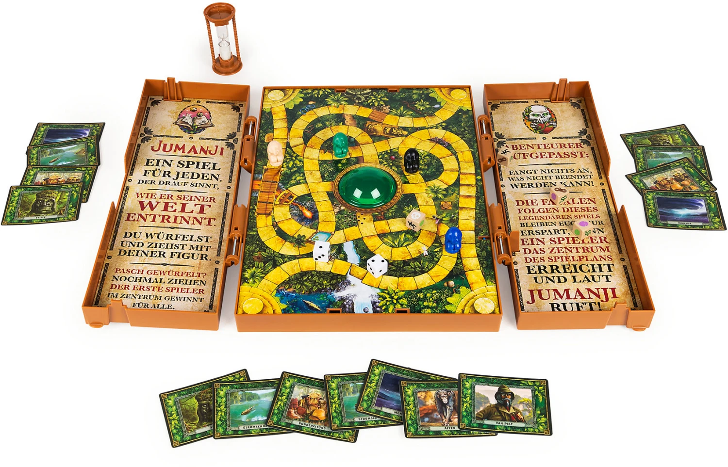 Spin Master Games Jumanji Deluxe – die elektronische Premiumausgabe des Erfolgsspiels – bekannt aus dem legendären Kinofilm. Abenteurer*innen aufgepasst: Fangt nichts an, was nicht beendet werden kann. Seid ihr mutig genug, um euch den Gefahren des legendären Spiels Jumanji zu stellen? Und sie zu bezwingen? Sobald ihr die Batterien eingelegt habt, begrüßen euch die Trommeln von Jumanji und euer mutiges Team findet sich plötzlich tief im Dschungel wieder. Blickt tief in die elektronische grüne Kuppel, die euch mit Licht- und Soundeffekten und spannenden Animationen in den Bann ziehen wird. Sie lässt euch Reime dechiffrieren und hält Challenges für euch bereit, die ihr bei eurem Abenteuer durch den Dschungel bewältigen müsst. Wer als Erstes das Zentrum des Spielplans erreicht, gewinnt für‘s ganze Team. Aber passt auf! Verliert ein*e Spieler*in das letzte Leben, verliert ihr alle gemeinsam. Ein modernes kooperatives Familienspiel, das die schnelle Auffassungsgabe fördert – hier muss gut kommuniziert, gerätselt und manchmal auch Pantomime gespielt werden, um als Team gegen das Spiel zu gewinnen. Dabei wird das ganze Spiel-Zimmer zur Kulisse für das große Dschungelabenteuer. Es werden zusätzlich 3 AA-Batterien benötigt, damit der Spaß sofort losgehen kann
