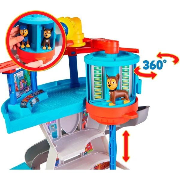 Mit dem Paw Patrol Lookout Tower Hauptquartier Spielset zum 10. Jubiläum der beliebten TV-Serie können Vorschulkinder ihre eigenen Rettungsmissionen nachspielen und erfinden. Dieses Spielset umfasst das aus der Serie bekannte Hauptquartier und das Basis-Fahrzeug von Chase sowie zwei Chase-Hundefiguren: Einen Chase, der gerade nicht im Dienst und daher ohne Uniform unterwegs ist und einen Chase im Helden-Modus. Der Wachturm ist etwa 50 Zentimeter hoch und bietet einen optimalen Aussichtspunkt. Wenn es Zeit für den nächsten Rettungseinsatz ist, wird der Chase ohne Uniform auf die Vorderseite des Aufzugs im Turm gesetzt, während der Helden-Chase auf die Rückseite gestellt wird. Wird der Aufzug dann so angehoben, dass er sich dreht, verwandelt sich der normale Chase zum uniformierten Helden-Chase. Chase sollte außerdem beim Steuerpult vorbeischauen, um die Mission des Tages mittels Auftragskarten auszusuchen. Nachdem die Auftragskarte und eine Fernrohkarte ausgewählt wurden, kann der Einsatzort durch das drehbare Fernrohr angesehen werden. Wenn Chase zur Rettungsmission starten soll, schiebt man ihn die Rutsche am Hauptquartier hinunter – er kann nun direkt in sein Polizei-Fahrzeug springen. Dann einfach auf die Abschussvorrichtung für das Fahrzeug drücken und schon geht es los. Art.-Nr.: 100007985
