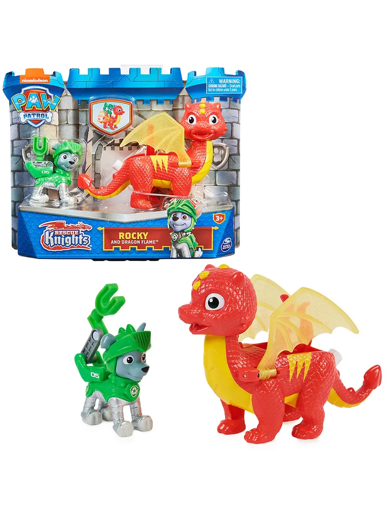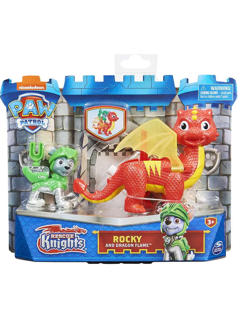 Erhältlich sind neben Rocky mit Drache Flame folgende Sets: Chase mit Drache Draco, Zuma mit Drache Ruby, Marshall mit Drache Jade, Skye mit Drache Scorch und Rubble mit Drache Blizzie. Für noch mehr Spaß mit den Lieblingsszenen aus PAW Patrol gibt es auch das Rescue Knights Ritterburg Hauptquartier als Spielset, den Drachen Sparks mit Welpe Claw und die ritterlichen Basis Fahrzeuge (jeweils separat erhältlich).