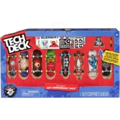 25 Jahre Tech Deck Fingerboards: Mit diesem Set zum 25-jährigen Jubiläum geht es in die Vergangenheit mit den coolsten Styles der größten Skate-Marken wie Santa Cruz, World Industries, Flip, Blind, Toy Machine und mehr. Neben 8 zusammengebauten Fingerboards enthält das 25th Anniversary Pack die limitierte Sammelfigur Teck Deck Dude. Abgerundet wird das Set von Stickerbögen mit coolen Aufklebern passend zu den enthaltenen Skate-Marken: So können die Boards ganz nach Belieben angepasst werden, mit dem Skate-Werkzeug lassen sich alle Boards beliebig umbauen. Tech Deck steht für authentisches Fingerboarden mit bekannten Skate-Marken und spannenden Rampensets. Start small – go big: Tech Deck für echte Skater ab 6 Jahren.Art.-Nr.: 100008436