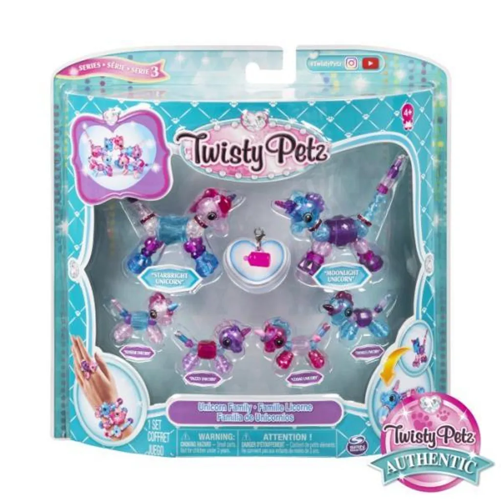 Was ist süßer als niedliche Tierfamilien? Twisty Petz-Familien. Die Twisty Petz sind super süße Perlen-Tiere, die sich im Handumdrehen in coolen Schmuck und wieder zurück verwandeln lassen. Die Twisty Petz Familiensets enthalten jeweils zwei große Twisty Petz, vier superniedliche Babys und einen besonderen Anhänger. Ob Bären, Einhörner, Elefanten oder Fantasietiere, hier findet jeder seine Lieblingstiere. Während sich die kleinen Babys in dekorative Fingerringe verwandeln lassen, werden aus den Eltern in Nu schicke Armbänder. Kombiniert man mehrere Tiere, erhält man sogar eine Halskette, die bei jedem Outfit zum Hingucker wird. Natürlich lassen sich die Tierchen aus den Familiensets auch mit anderen Twisty Petz aus allen Serien kombinieren. Hier kennt die Schmück- und Sammelleidenschaft keine GrenzenWarnhinweisechoking_hazard_small_parts