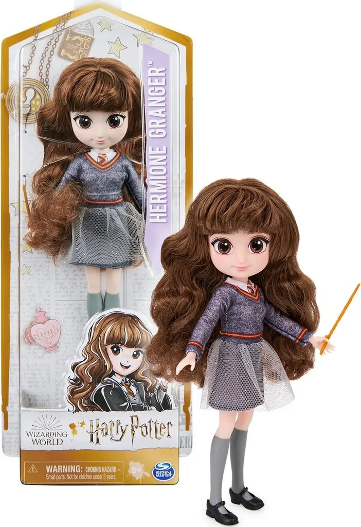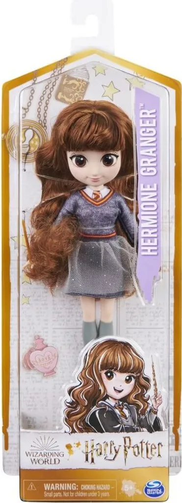 WWO Hermine Granger Puppe 20cm Mit den Wizarding World Puppen können kleine Fans in die Welt von Harry Potter eintauchen und Lieblingsszenen aus den Büchern und Filmen nachspielen sowie eigene Abenteuer bestehen. Süße Gesichtsdetails, Hermines weiches, extralanges Haar und fünf Artikulationspunkte erwecken die Puppen zum Leben. Hermine kommt in ihrer Hogwarts Schuluniform und bringt ihren eigenen Zauberstab mit. Inhalt: 1 Puppe 1 Zauberstab-Zubehör 1 Outfit 1 Paar Schuhe